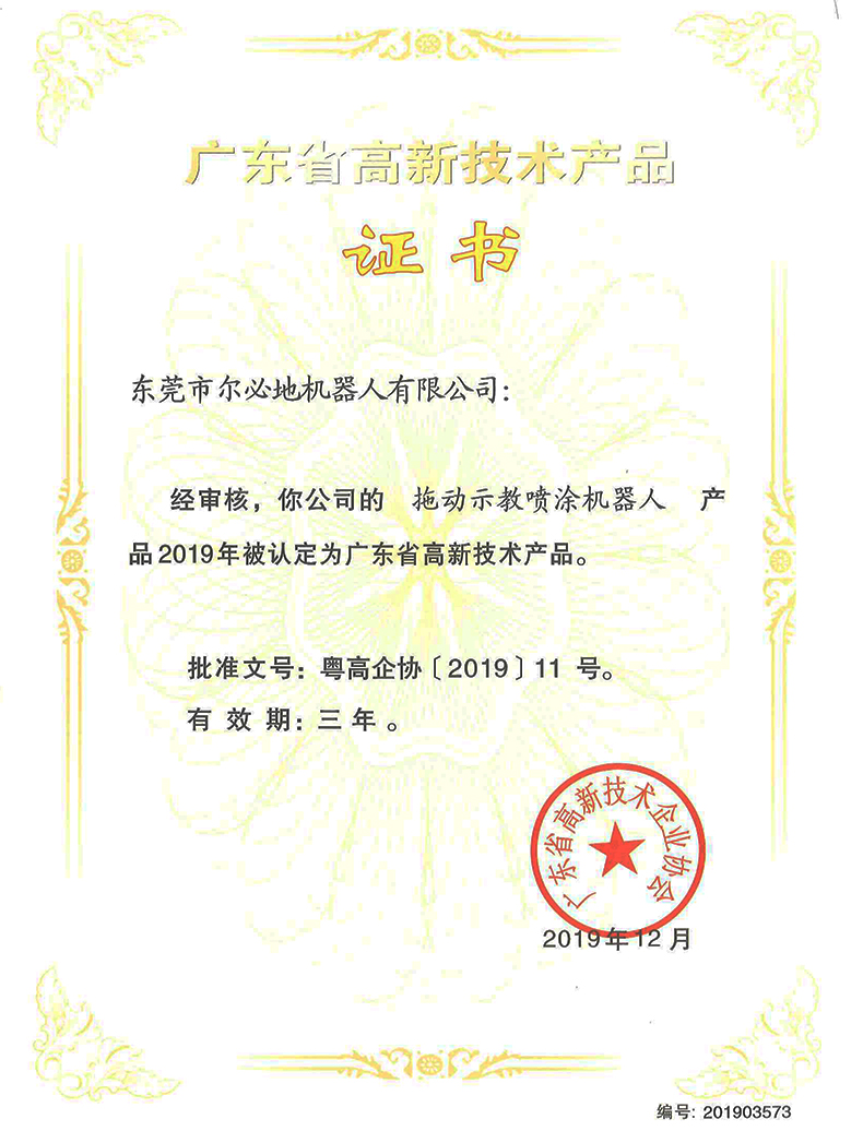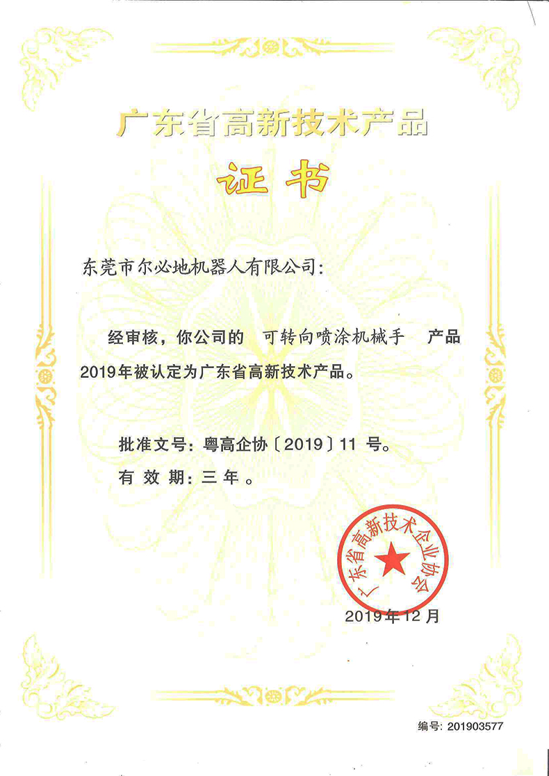 東莞市爾必地機器人有限公司在全體員工的共同努力下,經過嚴格的層層審查,最終喜獲由廣東省高新技術企業協會頒發的《廣東省高新技術產品證書》,此次獲得高新技術產品認定的產品有六個,分別是“可轉向噴涂機械手”、“多關節防爆噴涂機器人”、“拖動示教噴涂機器人”、“多關節碼垛機器人”、“多關節沖壓機器人”、“六軸噴涂機械手”。