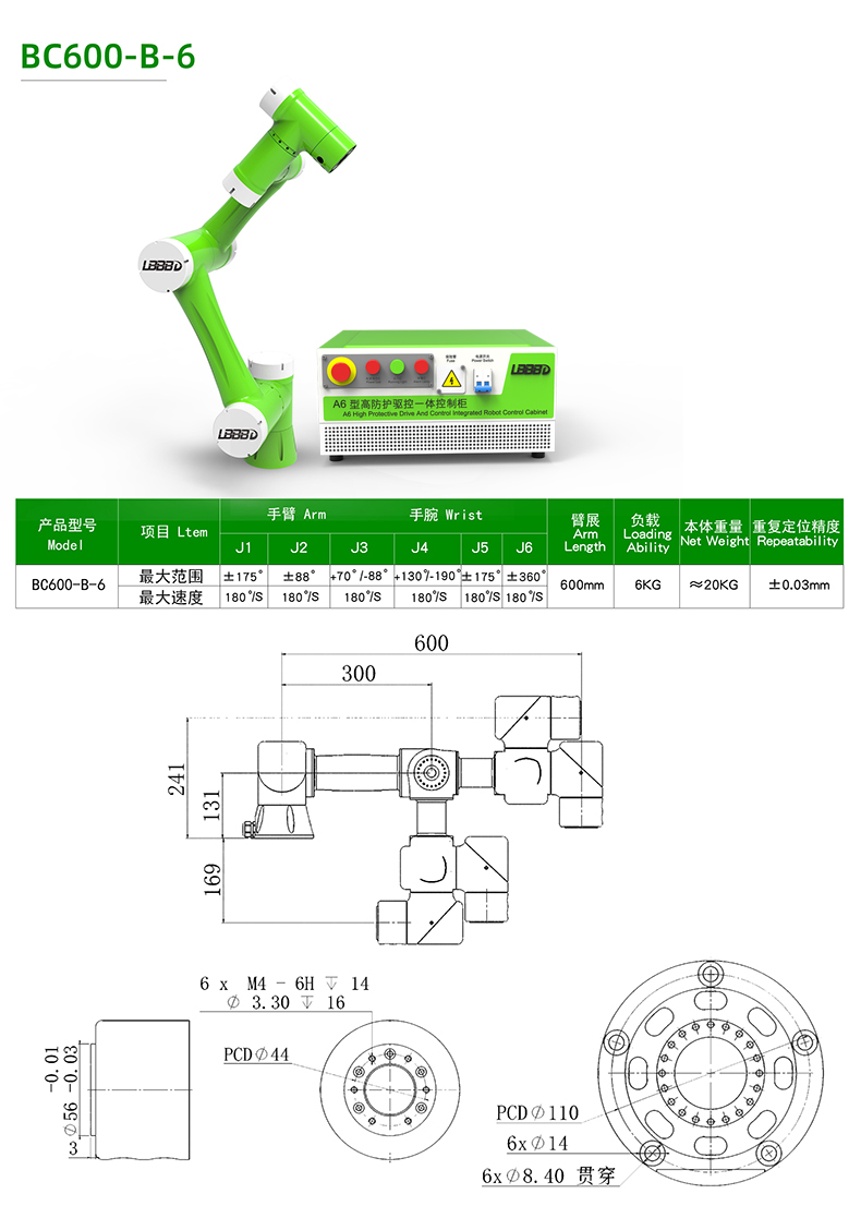 | 額定負載(kg) | 6 | 活動半徑(mm) | 600 |